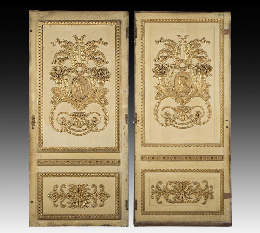 Giuseppe Maria Bonzanigo (Asti 6 settembre 1745-Torino 18 dicembre 1820) Coppia di porte in legno intagliato, laccato e dorato. Pannello superiore riccamente intagliato con girali, festoni e corone, dai quali dipartono due cornucopie ricche di fiori e foglie d'acanto che incorniciano un medaglione ovale contenente un profilo di nobildonna e l'altra un profilo di condottiero. Parte inferiore intagliata anch' essa da girali di foglie. Entrambe entro cornice intagliata e dorata. Una porta è contrassegnata da un'etichetta cartacea di un vecchio inventario. (cm 257x112; cm 265x118) (difetti) La Sovrintendenza per i Beni Culturali e Paesaggistici del Piemonte n. 33 del 04.02.2014 ha dichiarato il bene d'interesse culturale. Pair of carved and lacquered gilt wood doors in carved gilt-wood frames (defects)