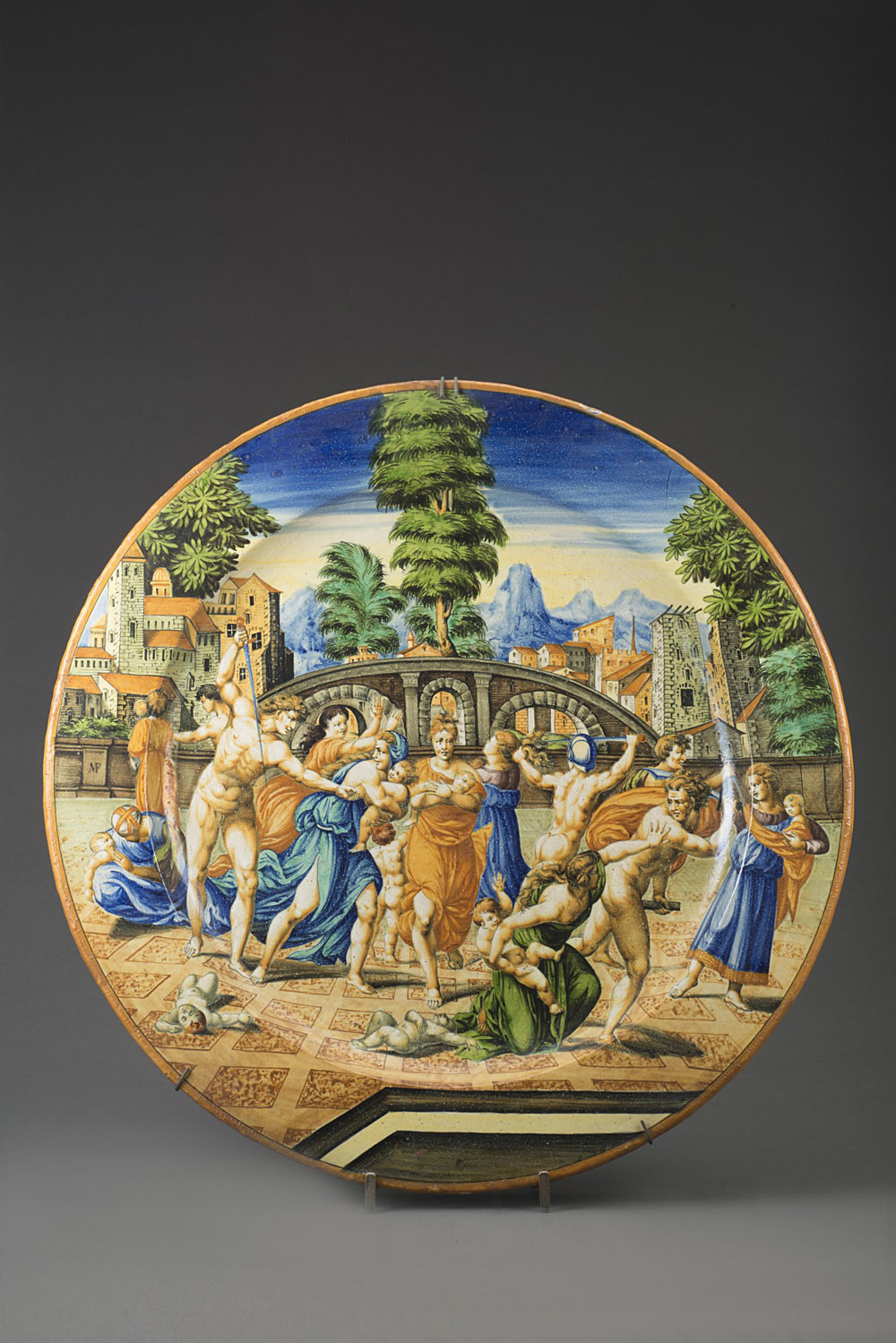 Grande piatto in maiolica istoriato a tutta superficie con la raffigurazione della 'Strage degli Innocenti' alla maniera delle manifatture cinquecentesche urbinati. Il soggetto è tratto dall’incisione di Marcantonio Raimondi (1482 circa/ 1534 circa) su un’invenzione di Raffaello (1483/1520), eseguita intorno al 1511/1512. Manifattura centro italiana, fine del sec. XIX (d. cm 50) (lievi difetti) L’episodio della Strage degli Innocenti è presente nel Vangelo secondo Matteo in cui Erode il Grande, re della Giudea, ordina un massacro di bambini allo scopo di uccidere Gesù, della cui nascita a Betlemme era stato informato dai Magi. Secondo il Vangelo, Gesù si salvò perché un angelo avvisò in sogno Giuseppe di fuggire in Egitto. Questo soggetto conobbe notevole fortuna nel mondo artistico rinascimentale. Large late 19th-century Italian majolica plate inspired by an engraving by Marcantonio Raimondi (around 1482 /around 1534) (minor defects)