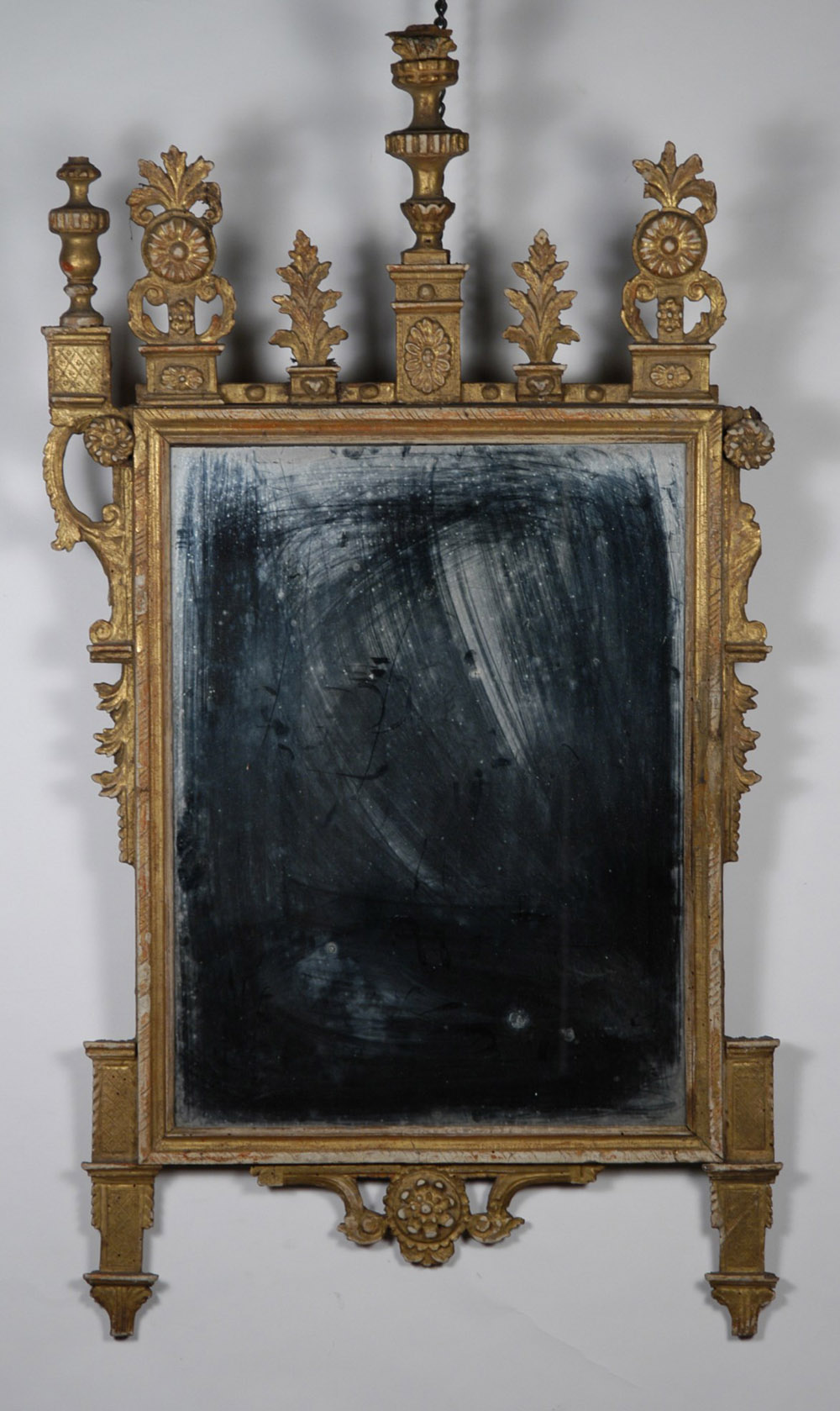 Specchiera in legno intagliato e dorato a rosoni, vasi e palmette. Toscana, sec. XVIII (cm 120x67) (restauri) 18th-century Tuscan carved wood mirror (restorations)