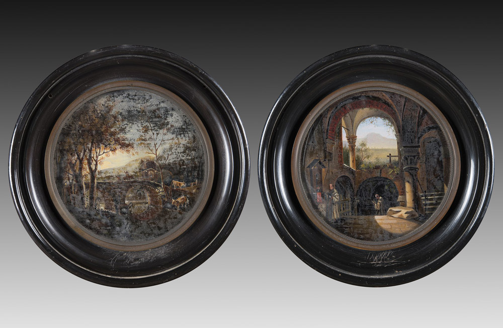 Maestro inizio sec. XIX "Paesaggio con ponte" e "Architettura con frati" Coppia di miniature ad olio su tela (d. cm 8,5) In cornici ebanizzate (difetti) Early 19th-century master "Landscape with bridge" and "Architecture with monks" pair of oil on canvas miniatures. Framed (defects)