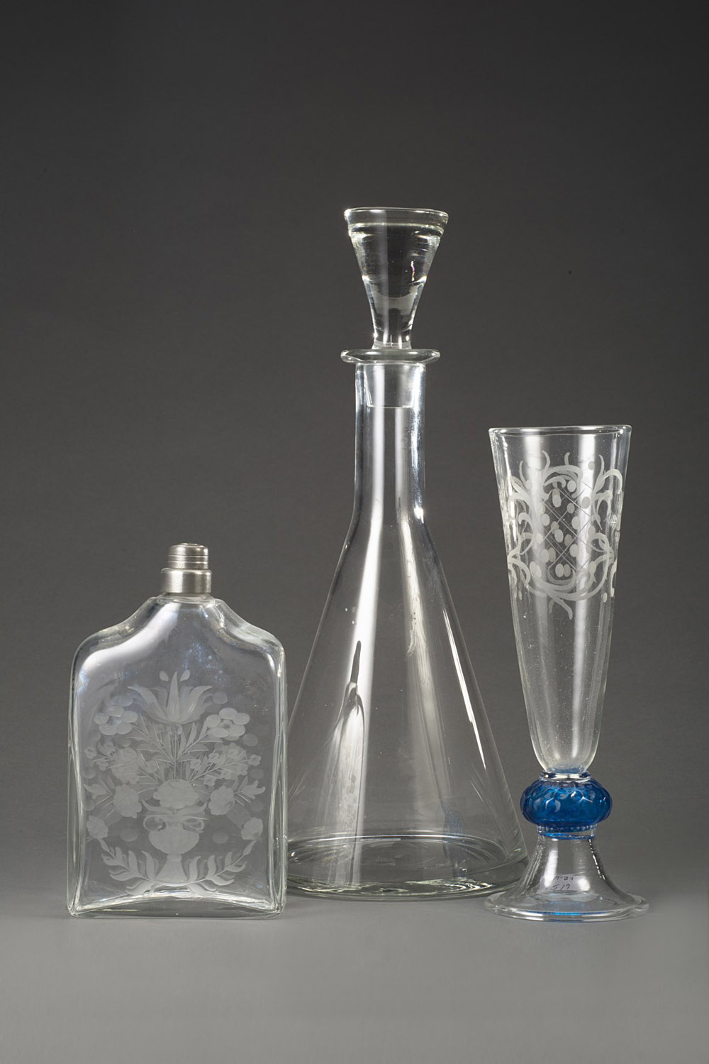 Lotto composto da un vaso, un flacone in vetro inciso e da una bottiglia in vetro (lievi difetti) Lot comprising a pot, a glass vial, and a glass bottle (minor defects)