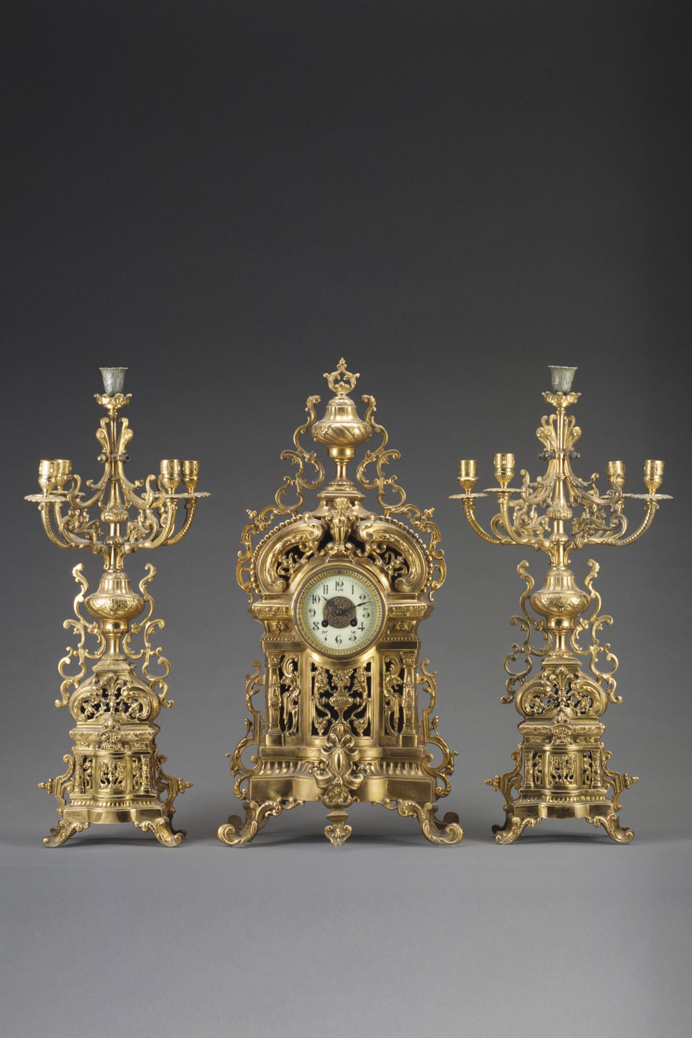 Trittico da camino in bronzo dorato decorato con ricco motivo fogliaceo Epoca Francia sec. XX Movimento con carica a otto giorni, suoneria delle ore e delle mezze su campanello, scappamento ad ancora, sospensione a molla Quadrante in smalto bianco con cifre arabe (orologio cm 65x34x21 candelieri h cm 63) 20th-century French gilt-bronze three-piece clock garnitura