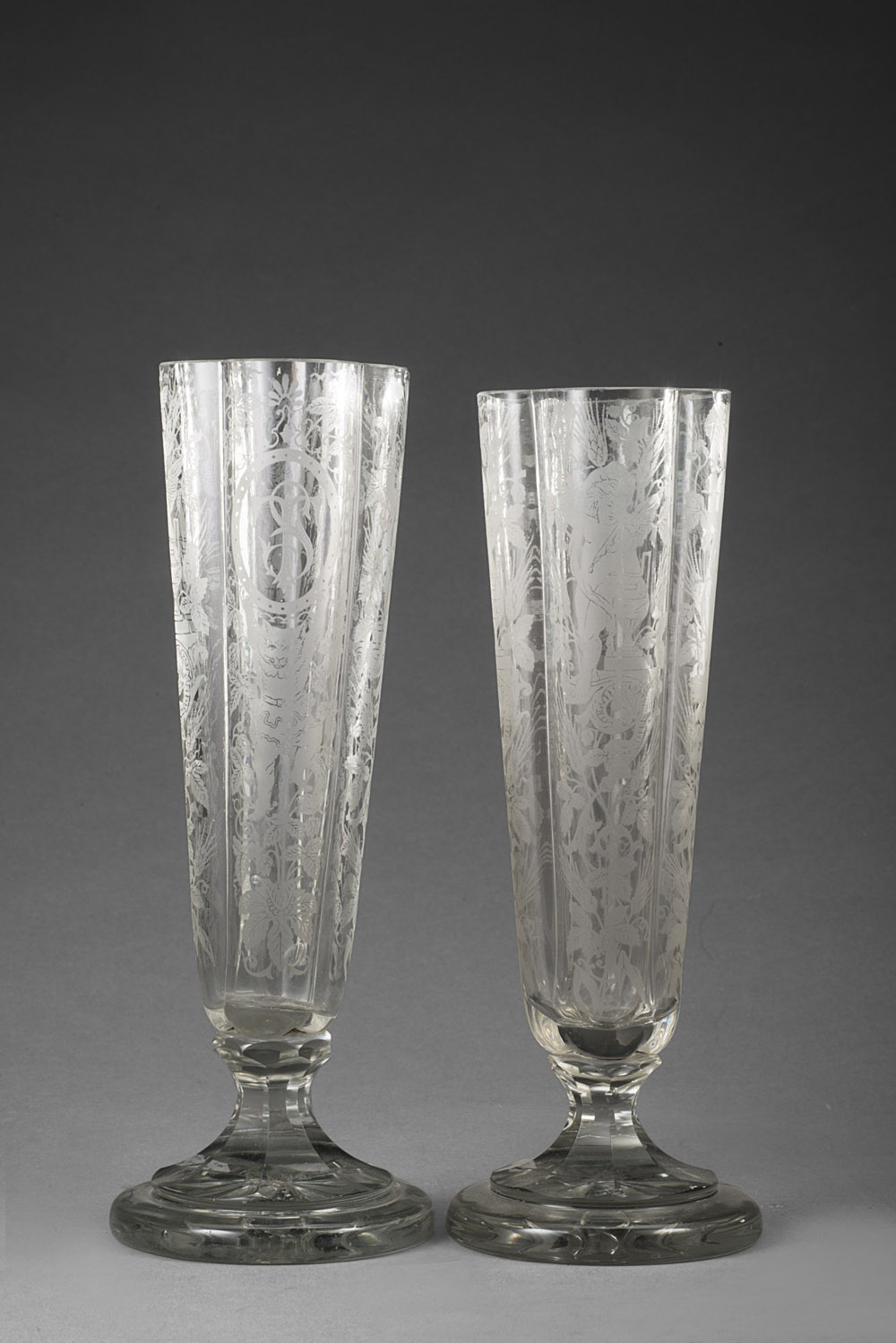 Lotto composto da due vasi in cristallo molato ed inciso decorati a volute e con figure di angeli. Misure diverse Lot comprising two crystal cut glass vases