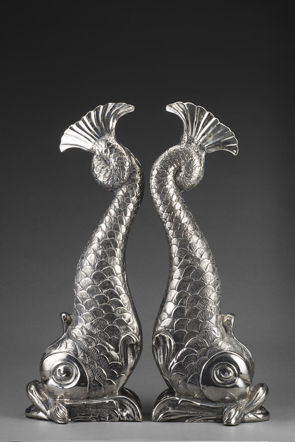 Coppia di sculture in metallo argentato raffiguranti due mostri marini a tutto tondo (h. cm 53) Pair of silver-plated metal sculptures