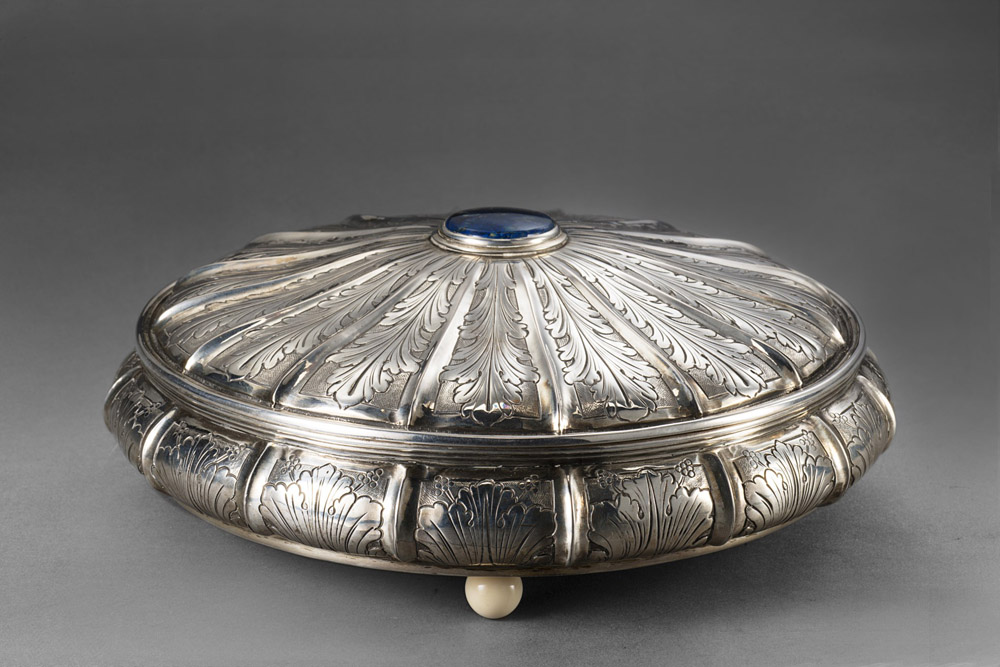 Scatola di forma circolare in argento costolata e cesellata con foglie. Lapislazzulo sul coperchio. Tre piedi in osso. Italia, anni '50 (d. cm 23) (gr lordi 850 ca) (difetti) Round ribbed silver box. Italy, 1950s (defects)