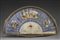 Ventaglio con stecche in avorio decorate a volute fogliate e scena di esterno con personaggi in abiti ottocenteschi. Pagina in carta dipinta e dorata; volute nei toni del blu e decorata a stampe con scene di vita e inerenti la scoperta dell'America. Sec. XIX (cm 26x50) Contenuto in teca (difetti) 19th-century fan with ivory stick. In glass case (defects)