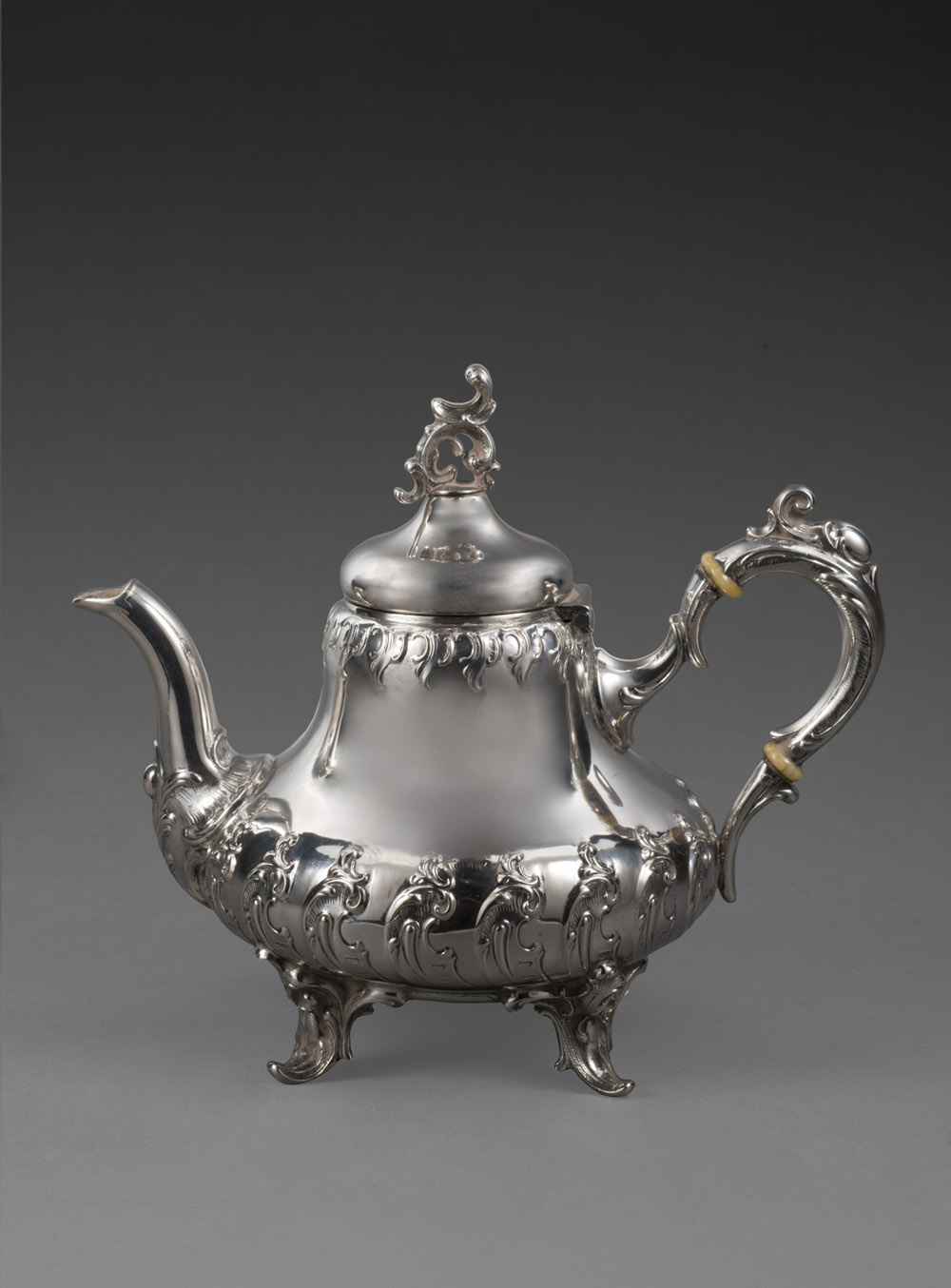 Teiera egoiste in argento con corpo piriforme schiacciato sorretto da quattro...