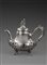 Teiera egoiste in argento con corpo piriforme schiacciato sorretto da quattro piedini a voluta decorato a sequenza di rocailles. Manico ad ansa e coperchio a cupola con presa traforata. Germania, fine sec. XIX (h. cm 14) (gr 270 ca) (lievi difetti) Late 19th-century silver teapot from Germany (minor defects)
