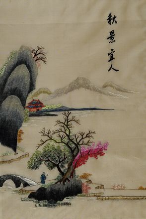 Paesaggio Pannello in seta con ricami, Giappone XX sec., cm. 46,5x32.