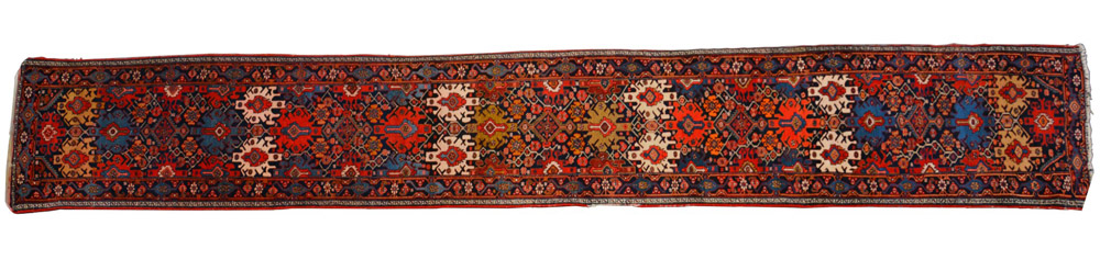 Passatoia Karabagh, Persia inizio sec. XX con fiori stilizzati nei colori del blu, rosso e avorio (cm 557x105) (difetti)