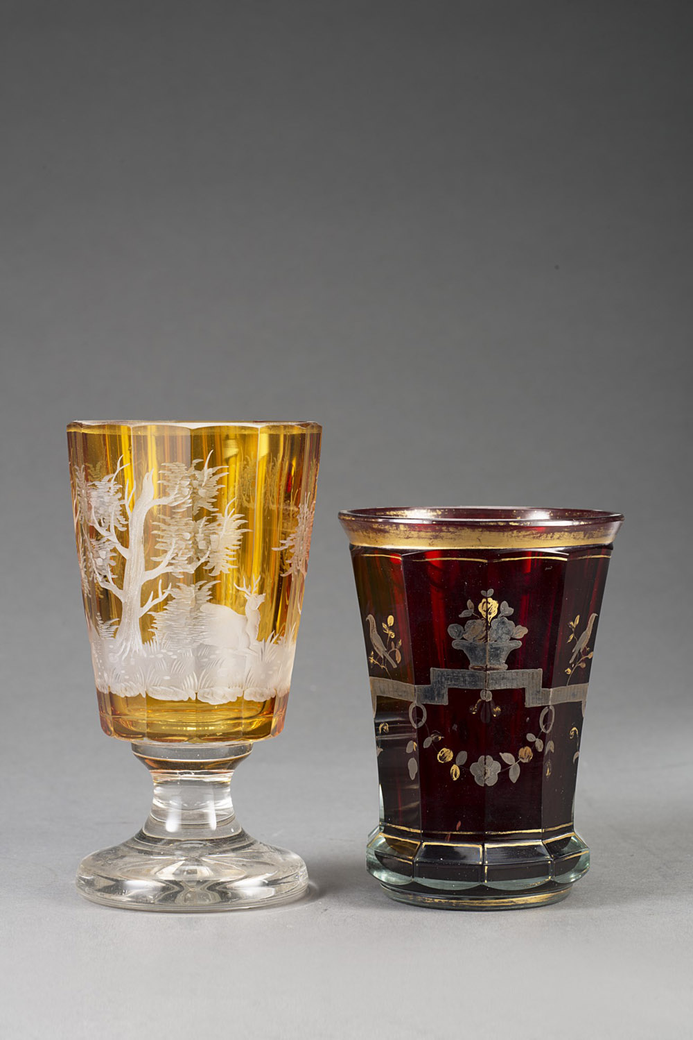 Manifattura di Boemia. Lotto composto da due bicchieri in vetro molato ed inciso a decoro diverso (lievi difetti) Lot comprising two Bohemian crystal cut glasses (minor defects)