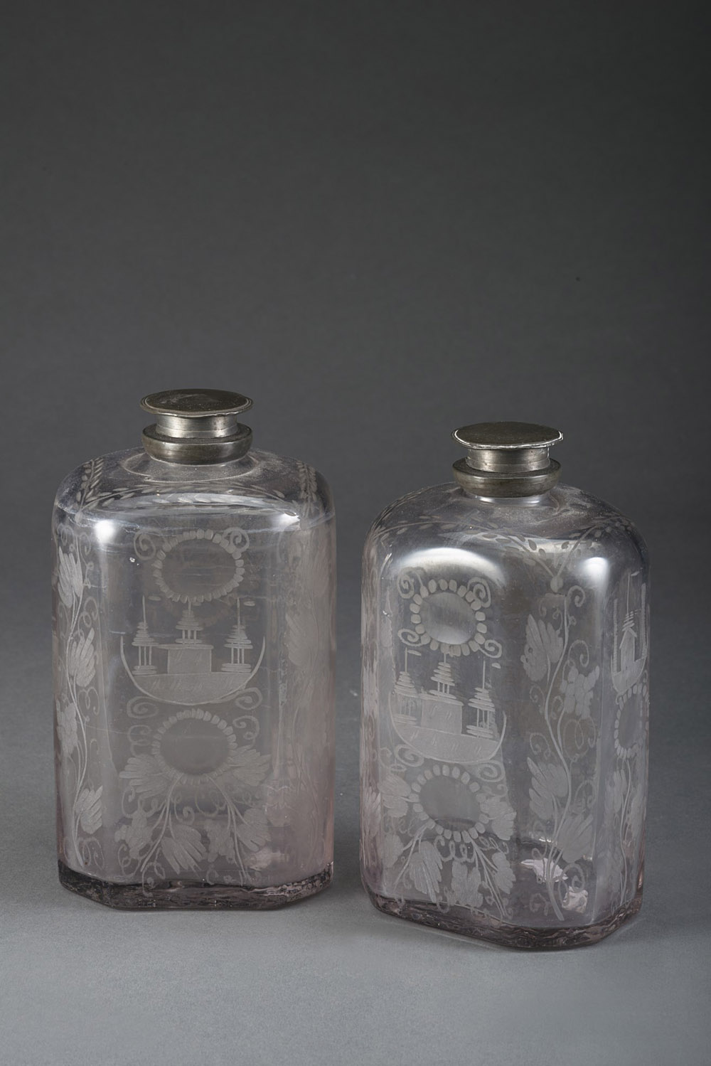 Manifattura del sec. XVIII. Coppia di bottiglie in vetro incolore con tappi e ghiere in peltro, decorati all'acido a pagode e motivi floreali (h. cm 17) (difetti ai tappi) Pair of 18th-century glass bottles (defects on caps)