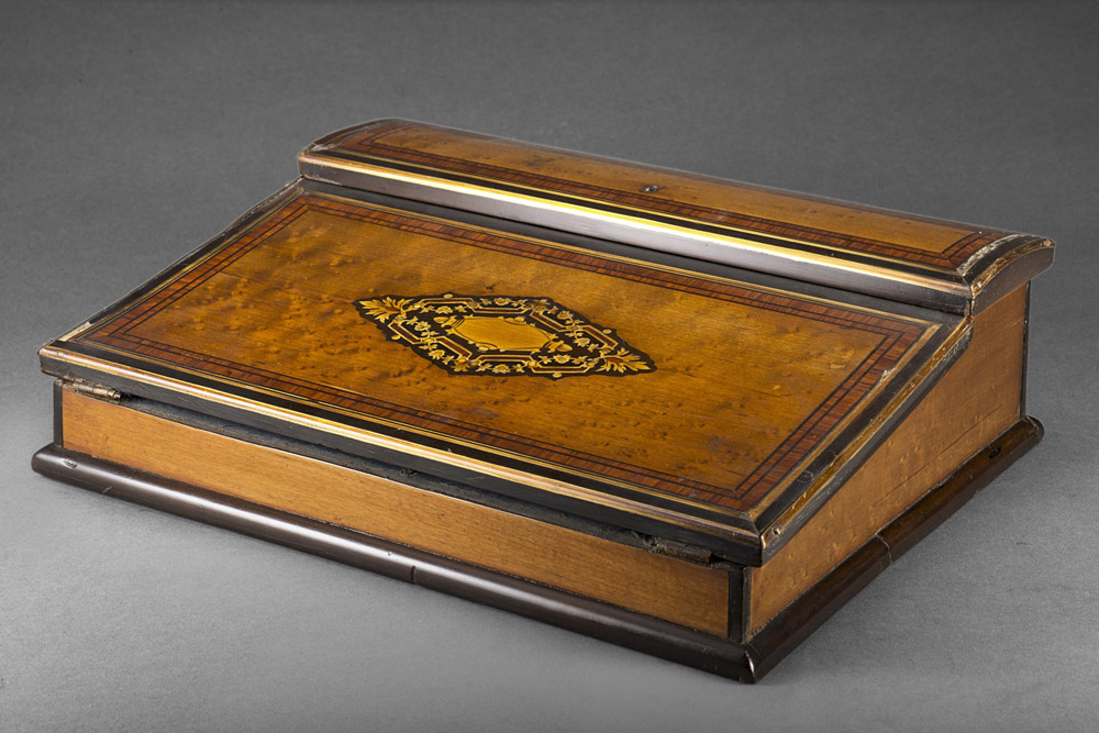 Scrittoio da viaggio con coperchi filettati intarsiati in ottone e madreperla...