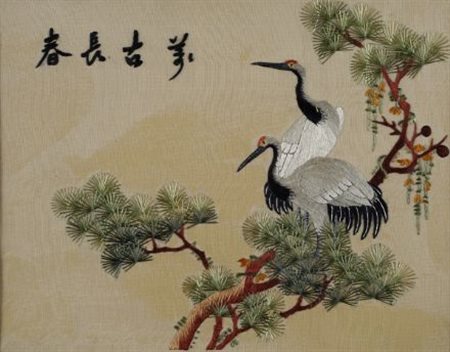 Cicogne pannello in seta con ricami in seta, Giappone, XX sec., cm. 22x28,5