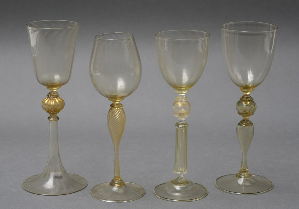 Manifattura di Murano sec. XIX. Quattro calici di foggia diversa in vetro paglierino Four 19th-century Murano glasses