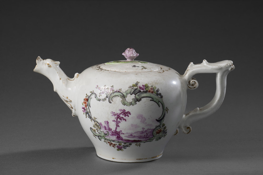 Manifattura di Vienna sec. XIX. Teiera in porcellana decorata in policromia a paesaggi nei toni del viola entro cornici floreali. Presa sagomata, beccuccio antropomorfo (difetti) 19th-century porcelain teapot from Vienna (defects)
