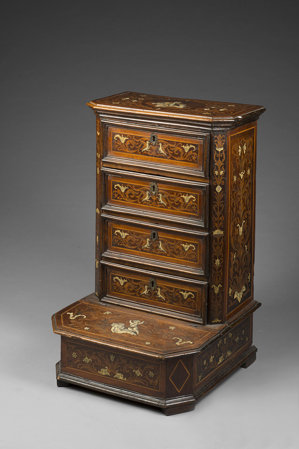 Inginocchiatoio in noce interamente intarsiato e filettato in legni vari a volute e fiori. Specchiature lastronate con inserti in avorio raffiguranti putti e fiori. Sec. XVIII, la tarsia di epoca posteriore (cm 59x93x60) (mancanze e restauri) 18th-century walnut kneeling stool (missing parts and restorations)