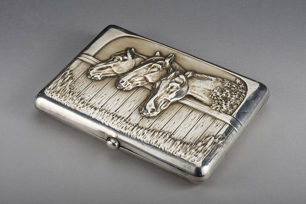Portasigarette in argento raffigurante tre teste di cavallo e motivi...
