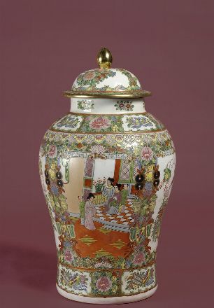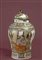 Vaso in porcellana policroma e oro, decorata con figure entro riserve, cm. h. 48