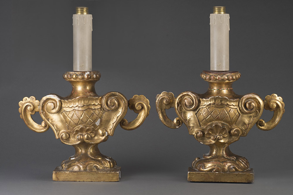 Coppia di portapalme biansati in legno intagliato e dorato a volute (montati a luce elettrica) Sec. XIX (difetti) Pair of 19th-century wooden church vases (defects)
