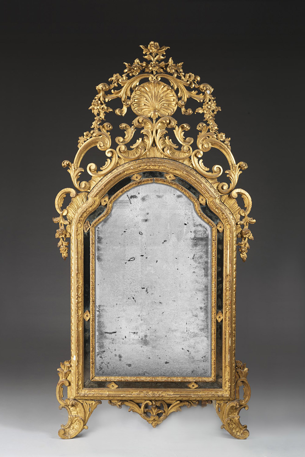 Specchiera in legno dorato con cimasa e sagome traforate e intagliate a mazzi fioriti e volute fogliate (h. cm 200x 90) Gilt-wood mirror