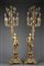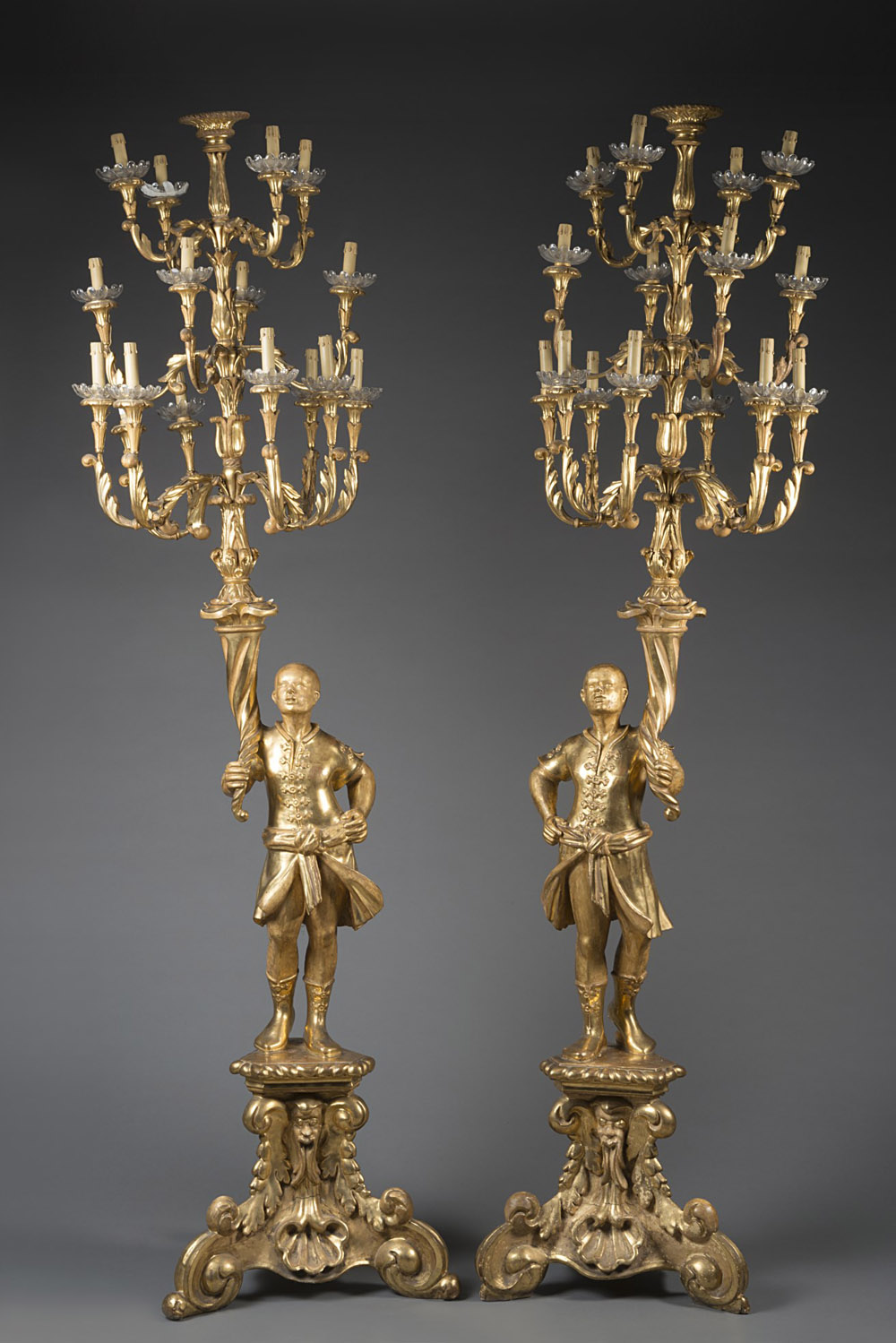 Coppia di mori reggitorcia in legno scolpito e dorato: torcera a sedici fiamme intagliate a motivi fogliacei, fusto a figura di servitore turco a tutto tondo, poggiante su base a plinto intagliata a conchiglia, mascheroni e tralci fioriti. Inizio sec. XIX (h. cm 240) (difetti) Pair of early 19th-century sculpted gilt-wood blackamoor candle holders (defects)
