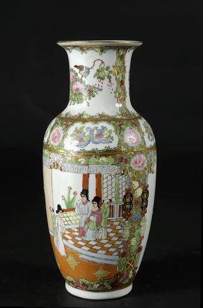 Vaso in porcellana, decorato in policromia su fondo bianco con scena domestica entro riserve, marcato alla base, Cina, XIX-XX sec..