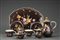 Manifattura tedesca inizio sec. XIX. Servizio da caffè in porcellana a fondo marrone decorato in policromia e oro a fiori, composto da: teiera, lattiera, zuccheriera, due tazze con piattini e vassoio sagomato Early 19th-century porcelain coffee set from Germany