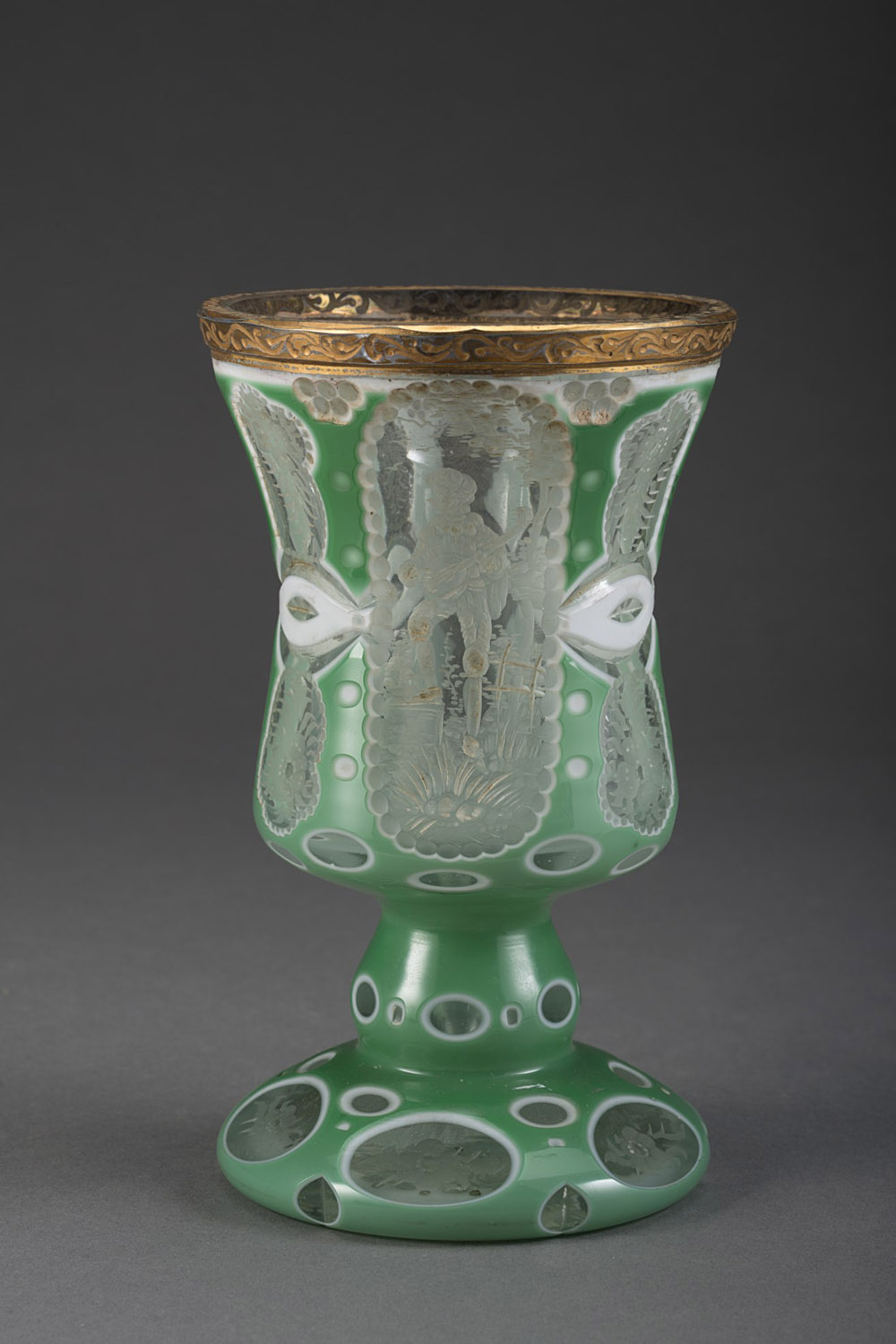 Manifattura di Boemia sec. XIX. Calice in cristallo a fondo verde decorato...