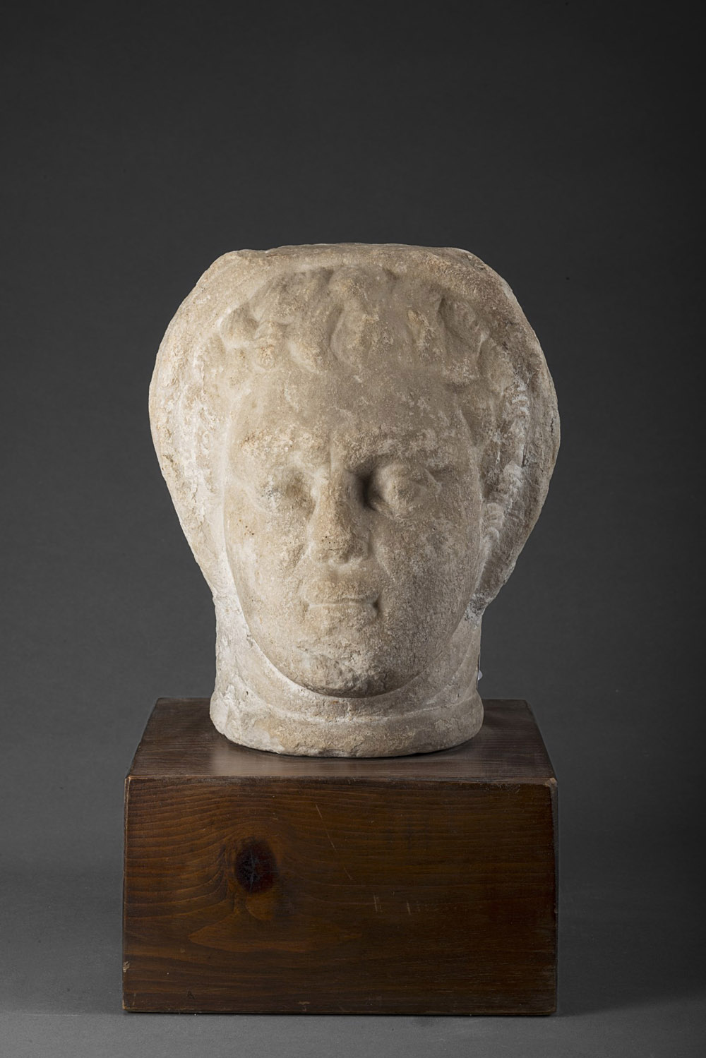 Antica testa in marmo raffigurante volto femminile alla maniera arcaica (h....