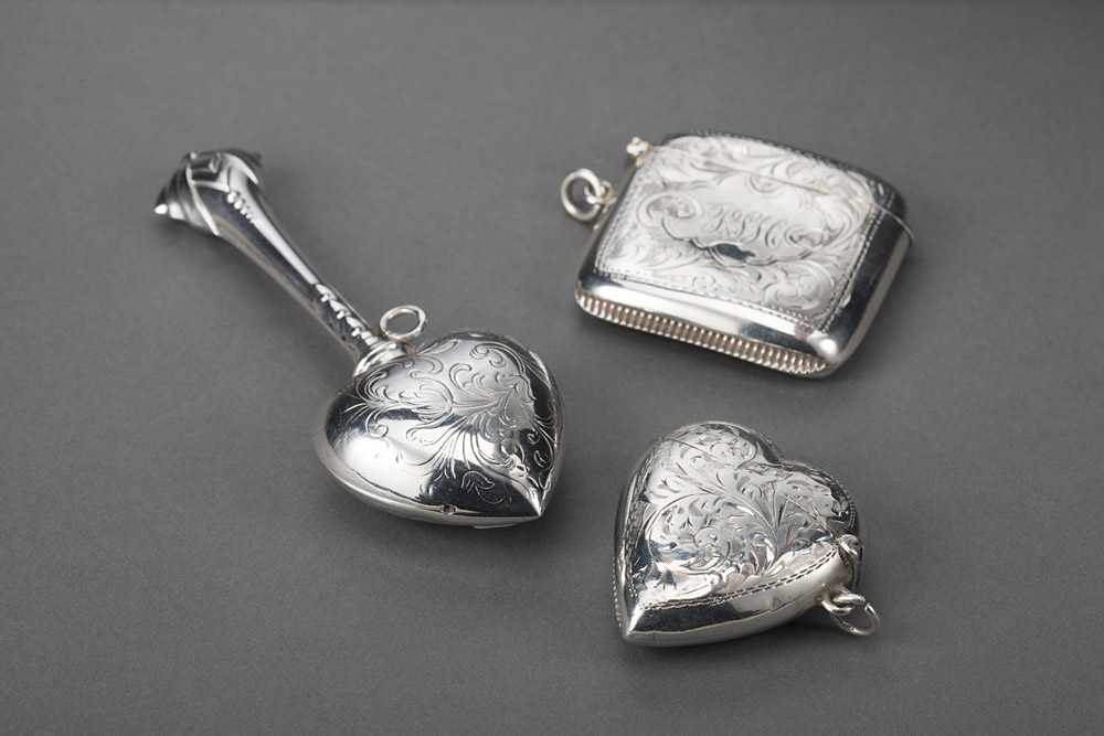 Lotto composto da due portafiammiferi in argento di cui uno a forma di cuore, Inghilterra, sec. XX. Uniti a un sonaglio per bambini in argento, Stati Uniti, sec. XX (misure diverse) (difetti) Lot comprising two 20th-century English silver matchstick holders and a 20th-century rattle from the US (defects)