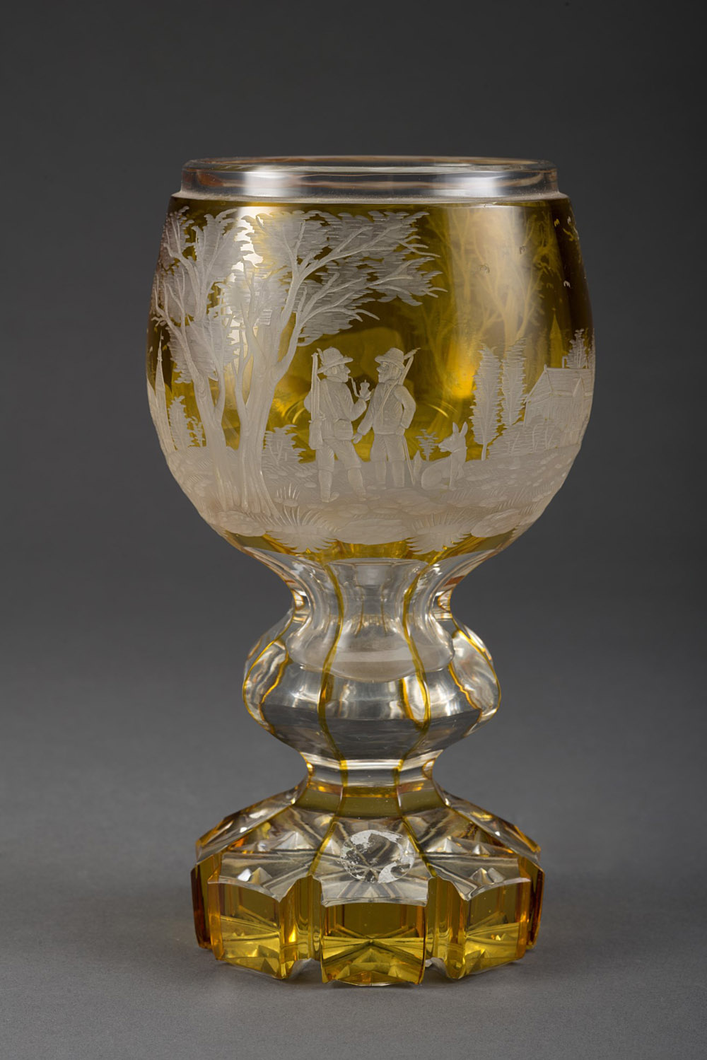 Manifattura di Boemia inizio sec. XX. Calice in cristallo paglierino decorato all'acido con paesaggio, cervo e cacciatori (h. cm 18) Early 20th-century Bohemian crystal goblet