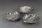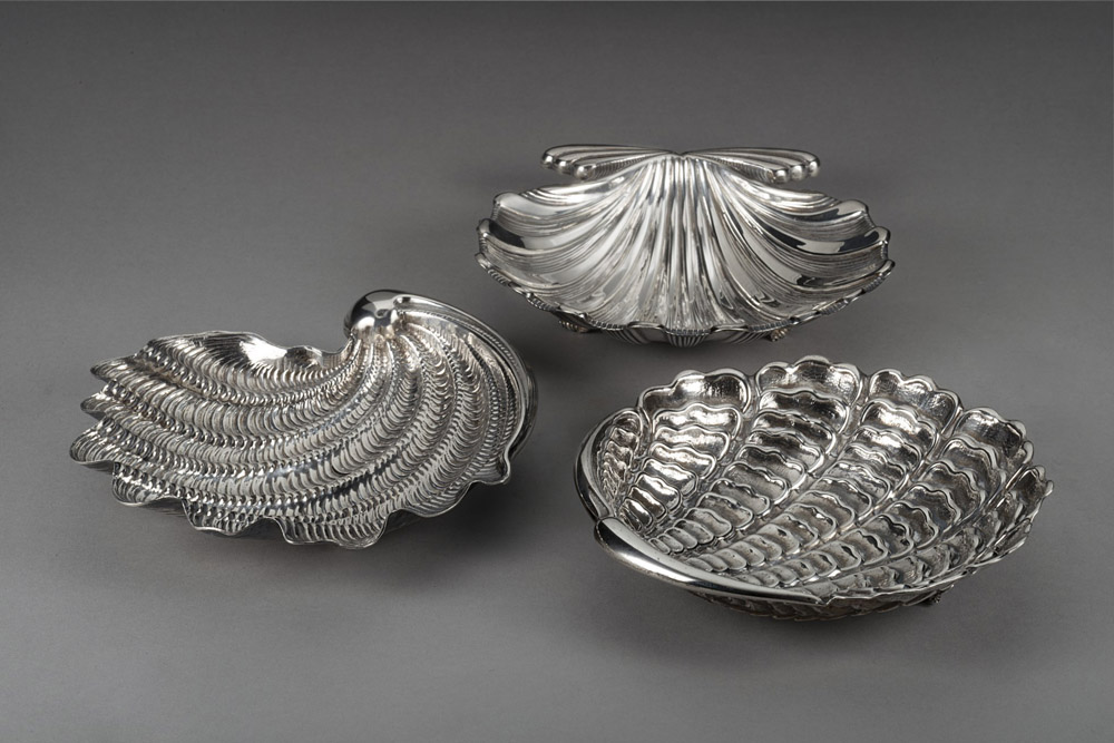 Gruppo di tre portacenere a forma di valva di conchiglia marcate Gianmaria Buccellati (gr 600 ca) (lievi difetti) (lungh. max cm 15) Group of three ashtrays (minor defects)