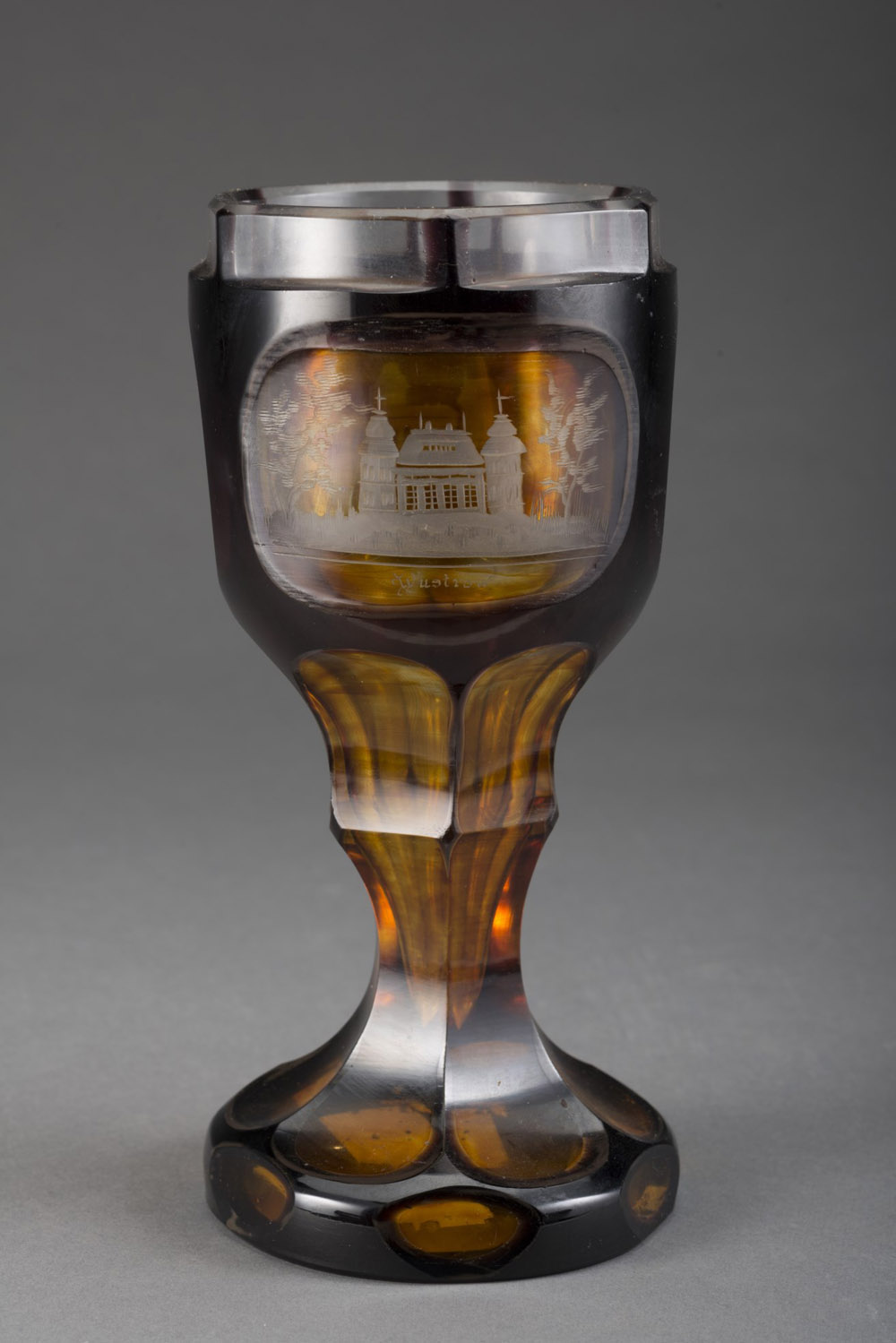 Manifattura di Boemia, inizio sec. XX Calice in cristallo ambrato decorato all'acido con vedute di "Prevors" e "Wustrow" (h. cm 20) Early 20th-century Bohemian crystal goblet