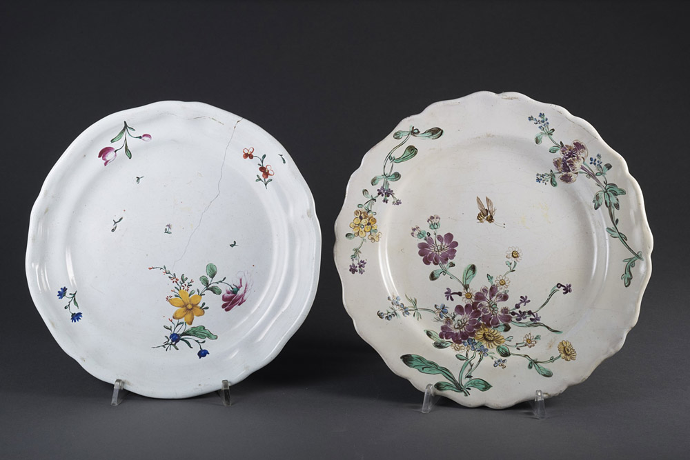 Due piatti tondi polilobati di misure e decori diversi in maiolica policroma a piccolo fuoco con decoro ‘alla rosa’. Uno presenta sul retro la marca di fabbrica di Holics (Ungheria), fine del sec. XVIII/XIX, diametro cm. 23, grossa felatura. L’altro ha forma polilobata, diametro cm. 23,5, restauri. Francia, (Marsiglia ?), seconda metà del sec. XVIII Two round majolica plates. France, second half of the 18th-century