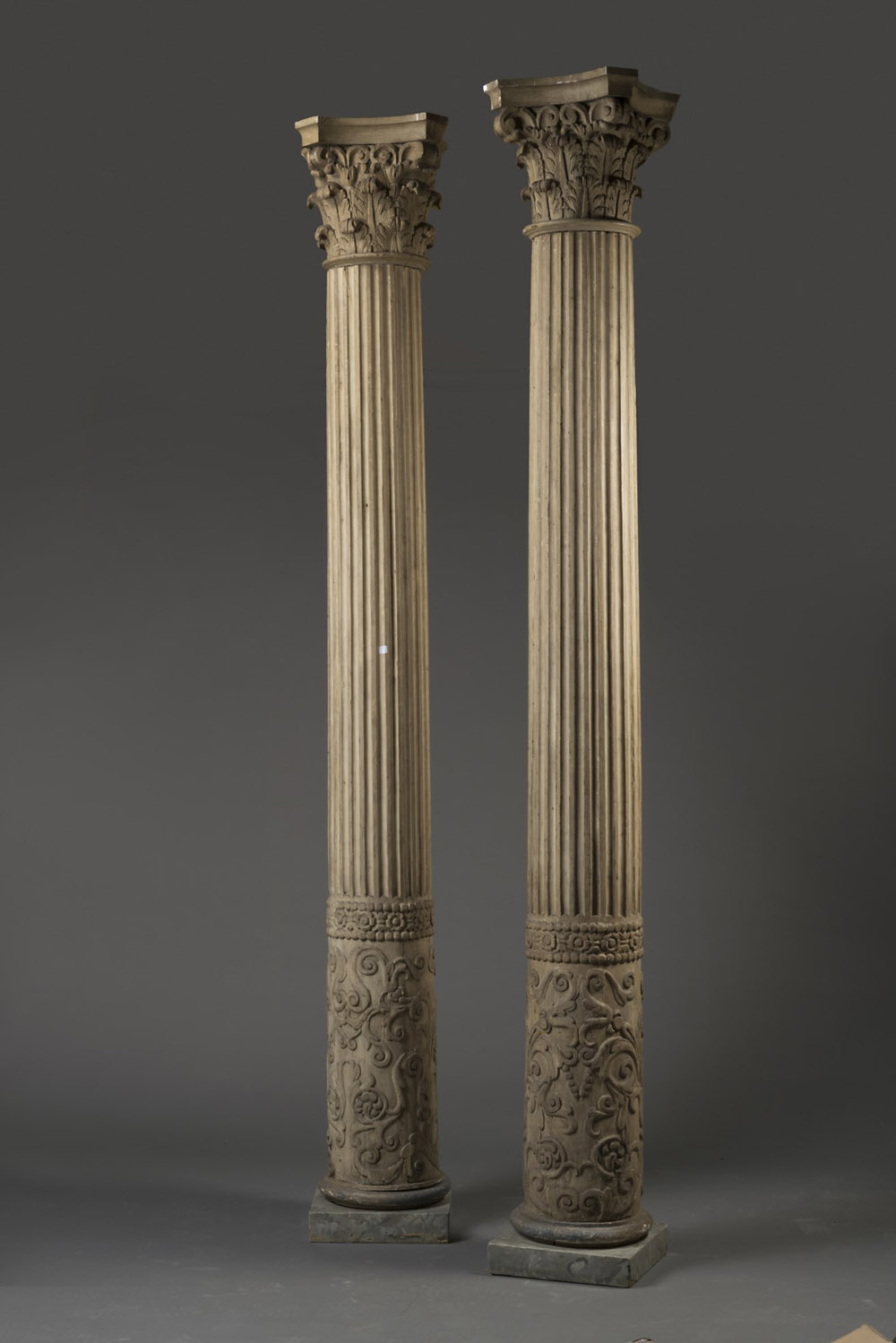 Coppia di colonne in legno scolpito con capitello corinzio e fusto scanalato. Parte inferiore, scolpita a girali di foglie e fiori poggiante su base rettangolare. Sec. XVIII(difetti) (h. cm 2,80) Pair of 18th-century sculpted wooden columns (defects)