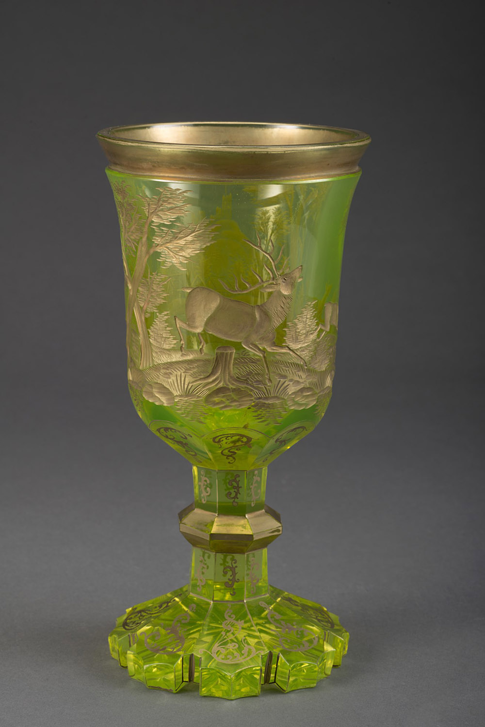 Manifattura di Boemia, fine sec. XIX. Calice in vetro verde molato e dorato a paesaggi con cervi (h. cm 21,5) (lievi difetti) Late 19th-century Bohemian glass goblet (minor defects)
