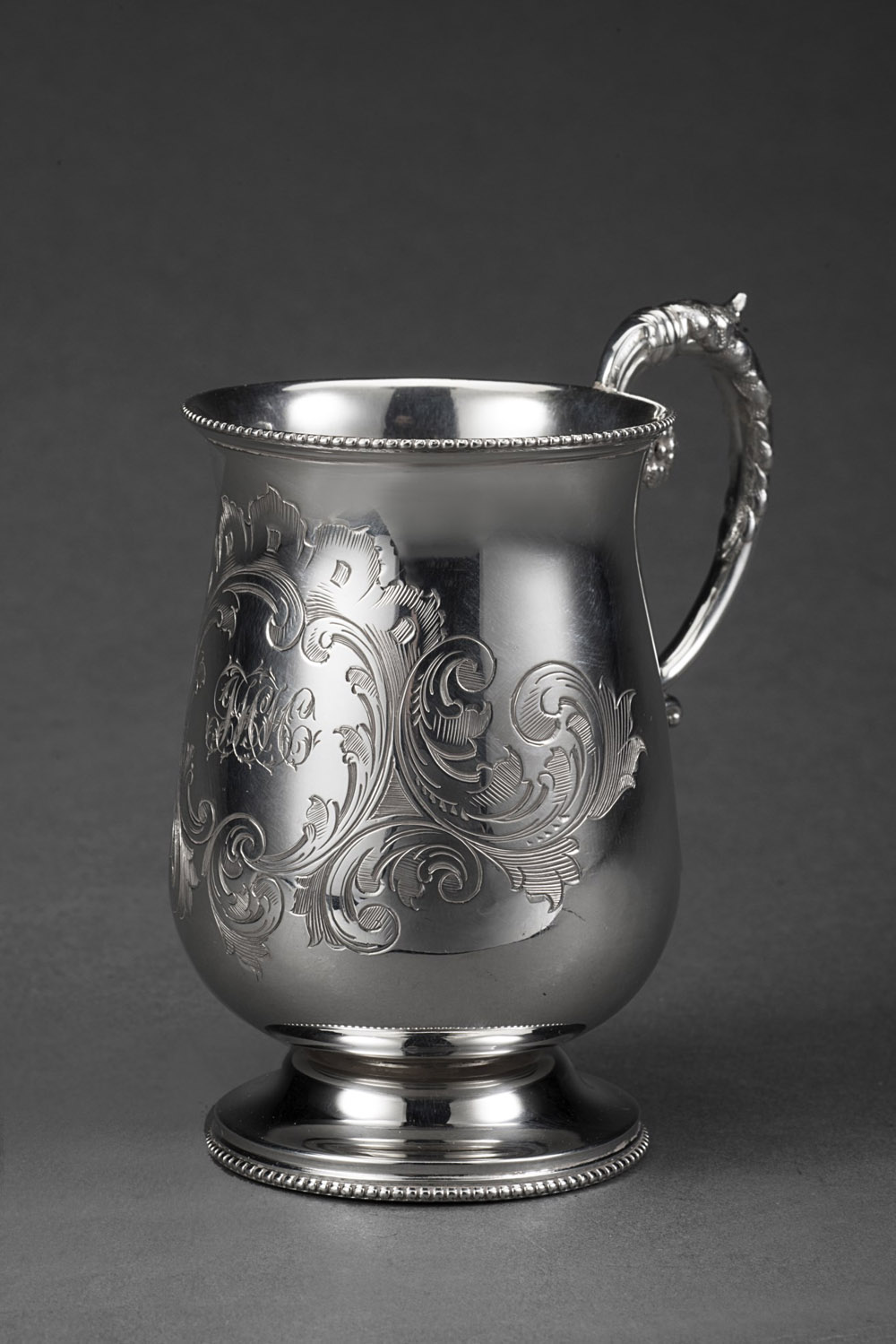 Piccolo boccale in argento con corpo a vaso cesellato con volute fogliate e cifrate su fondo liscio. Profili perlinati. Città di Sheffield, 1879. Argentiere John Round & Son LTD (h. cm 10) (gr 120 ca) Small silver mug, Sheffield, 1879