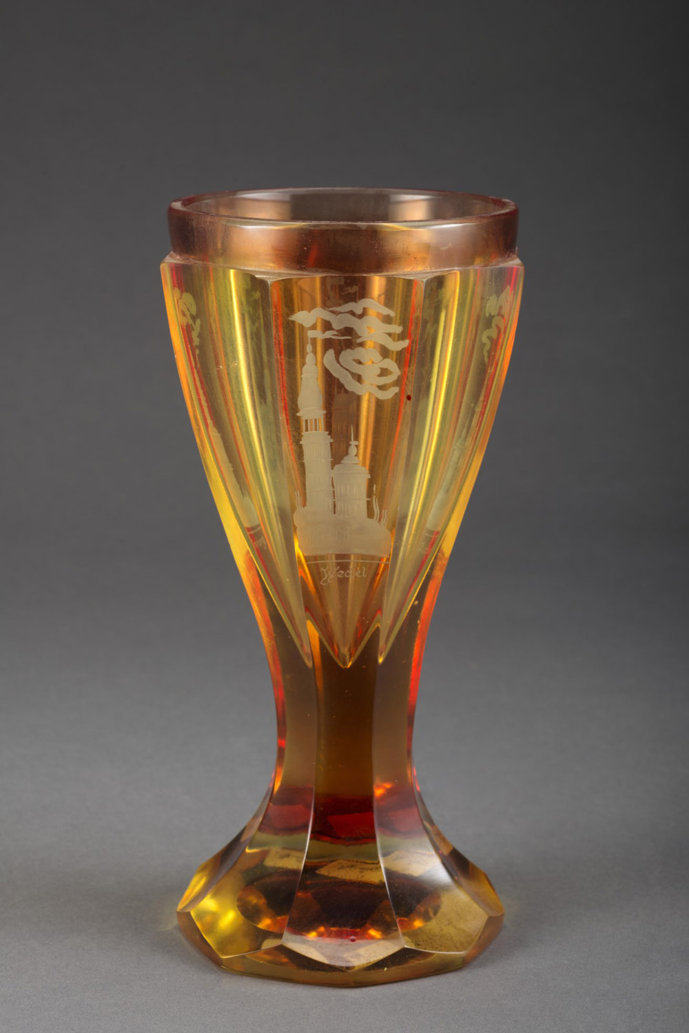 Manifattura di Boemia, inizio sec. XX. Calice in cristallo arancione decorato all'acido con vedute di palazzi (h. cm 21) Early 20th-century Bohemian crystal goblet