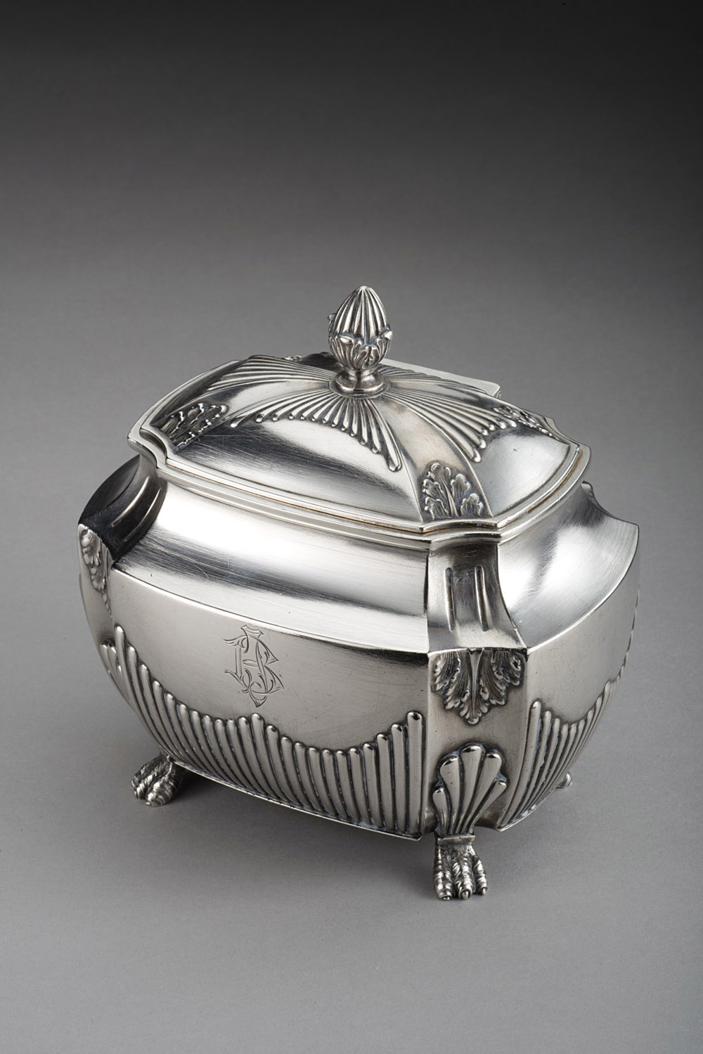 Lot 308 | Zuccheriera in argento poggiante su quattro piedi ferini, corpo decorato a...
