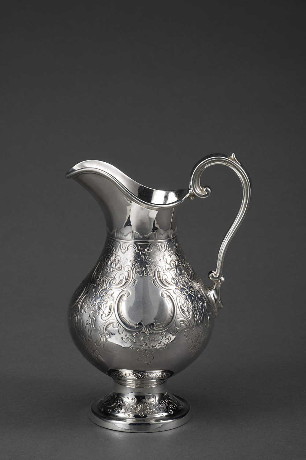 Lattiera in argento con corpo ad anfora decorato con fiori, frutta e volute....
