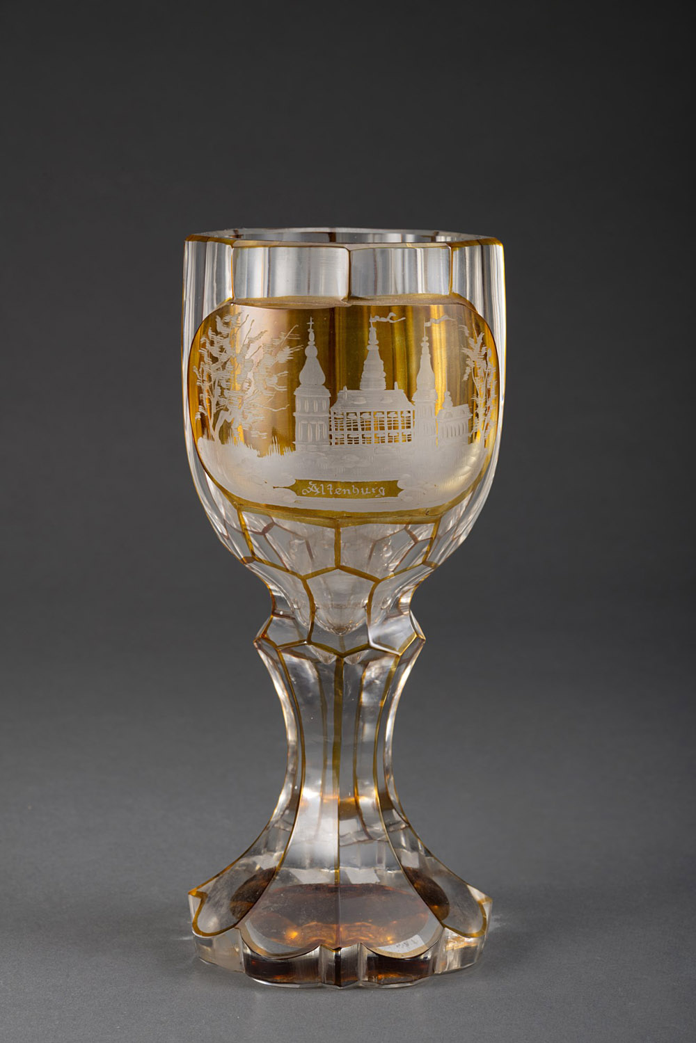 Manifattura di Boemia, inizio sec.XX Calice in cristallo con bordi in arancione e decorato all'acido con veduta di "Altenburg" con base polilobata (h. cm 21) Early 20th-century Bohemian crystal goblet