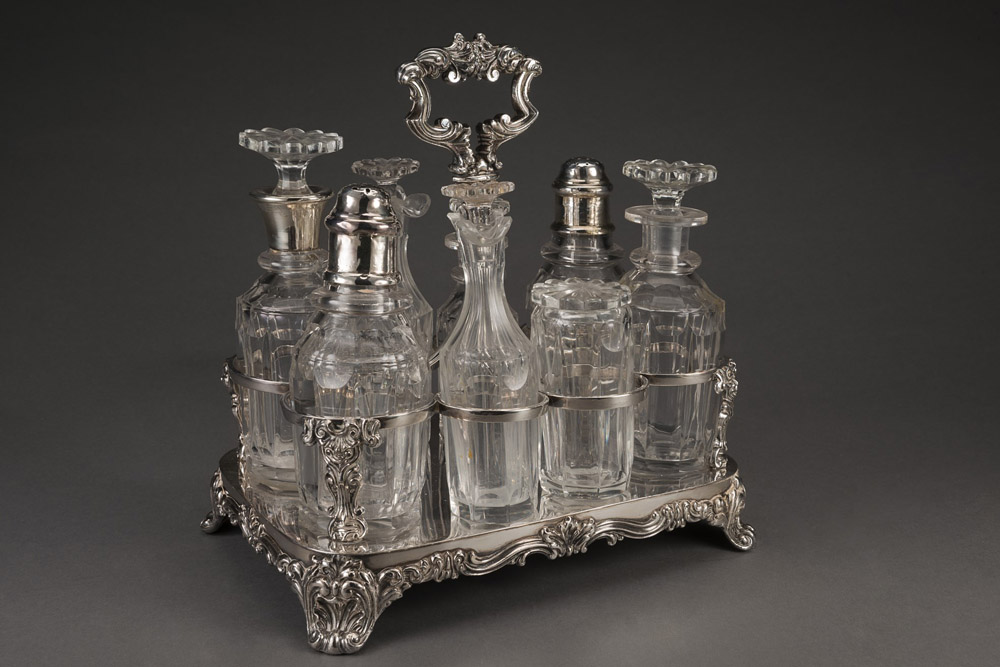 Cruet in metallo argentato con base e montante decorati a volute fogliate,...