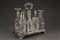 Cruet in metallo argentato con base e montante decorati a volute fogliate, bottiglie in vetro. Inizio sec.XX (cm 24x27x15) (difetti) Early 20th-century silver-plated metal cruet (defects)