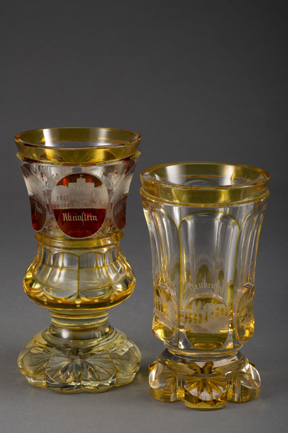 Manifattura di Boemia, inizio sec.XX. Due calici in cristallo decorati all'acido con vedute di palazzi Two early 20th-century Bohemian crystal goblets