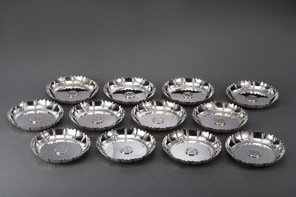 Gruppo di dodici posaceneri in argento con bordo sagomato decorati al centro...