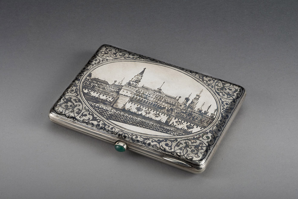Portasigarette in argento niellato raffigurante una veduta del Cremlino;...