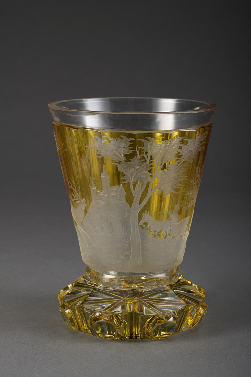 Manifattura di Boemia, inizio sec. XX Calice in cristallo a fondo giallo decorato all'acido con scorcio di città e cervo (h. cm 14) Early 20th-century Bohemian crystal goblet