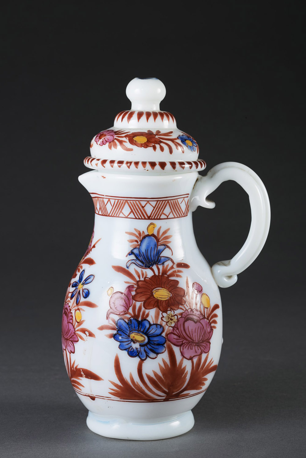 Piccola caffettiera con coperchio in vetro lattimo. Corpo piriforme e coperchio ‘alla persiana’. Decorazione a fiori in rosso ferro e blu di gusto orientale. Veneto, sec. XIX (h. cm 16) (lievi difetti) Small 19th-century coffee pot from Veneto (minor defects)