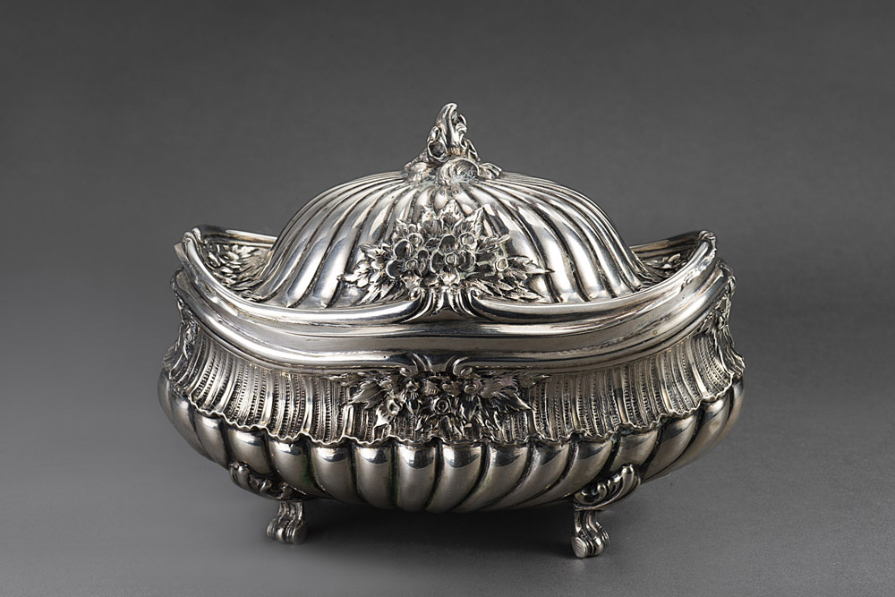 Zuccheriera a barchetta tipo "torinese" in argento decorata a rose, baccellature e onde. Italia, sec. XIX (gr 280 ca) (h. cm 11xlargh. cm 15) (difetti) 19th-century Italian silver sugar bowl (defects)